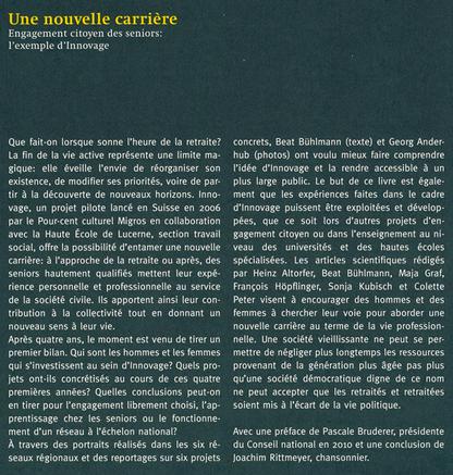 Dans cet ouvrage, Beat Bühlmann présente Innovage à travers des portraits réalisés dans les réseaux régionaux et des reportages sur six projets concrets. Des articles thématiques complètent le livre et visent à encourager des hommes et des femmes à chercher leur voie pour aborder une nouvelle carrière au terme de la vie professionnelle.