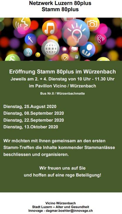 Das Netzwerk 80plus konnte ab März 2020 seine neuen Stammanlässe im Vicino im Würzenbach wegen dem CORONA-Virus nicht wie geplant eröffnen. NeuStart vom Stamm 80plus im Würzenbach am 25. August