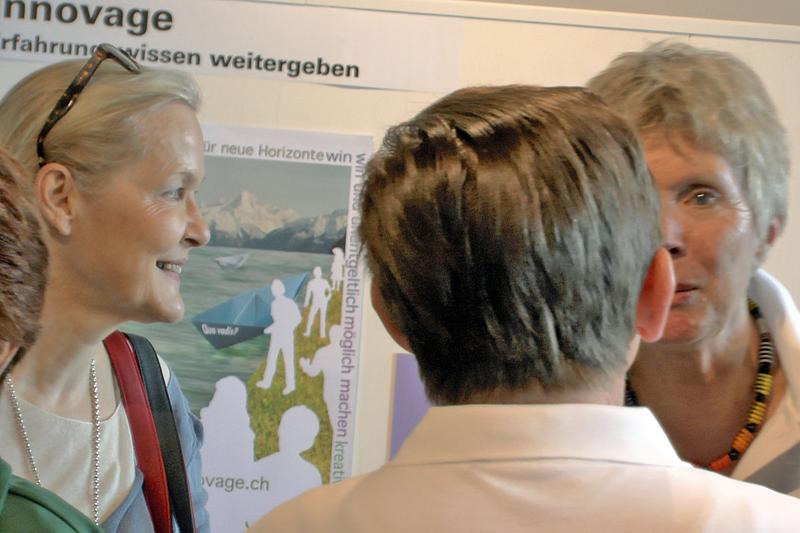 Ein stetes Summen wie in einem Bienenstock begleitet den Besucher durch den mit Ständen flankierten Saal. Der Anlass ist sehr gut besucht. Beigen von Broschüren, Visitenkarten und Infomaterialien warten auf Interessierte. Trauben von meist grauhaarigen Leuten stehen buntgemischt vor den Infotischen und plaudern über Ideen und Projekten ihrer Generation. Die junggebliebenen Sechziger werfen wohl einen „Blick zurück nach vorn“, wie die Einladung verspricht. Am Stand von Innovage fallen die Betreuerinnen und Betreuer vor allem durch ihre weissen T-Shirts auf. Bemerkenswert oft werden sie (Dagmar, Gertrud, Bruno und Josef) in persönliche Gespräche verwickelt – Begegnungen von Interessierten für Interessierte. Hier studiert eine elegant gekleidete Frau den Innovage-Prospekt, da schnappt sich ein graumelierter Herr von der Ablage ein „Tröpsli“ aus dem Körbchen.